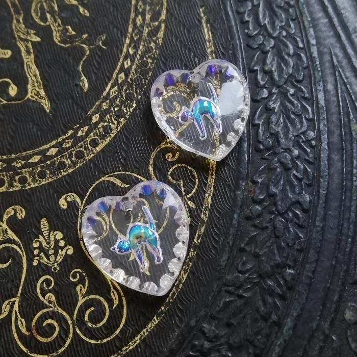ヴィンテージ ドイツ オーロラキャット 猫 ネコ インタリオ ハート ガラス ペンダント 15x14mm 【1個】