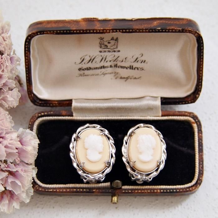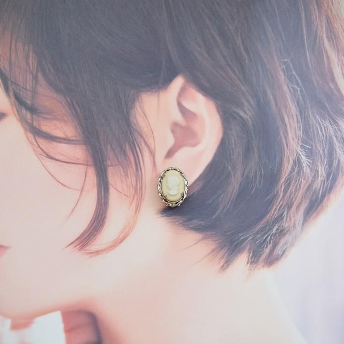 ベージュバックカラーが優しいい雰囲気のガラスカメオをイヤリングに仕立てました。