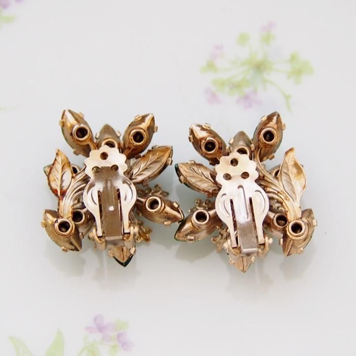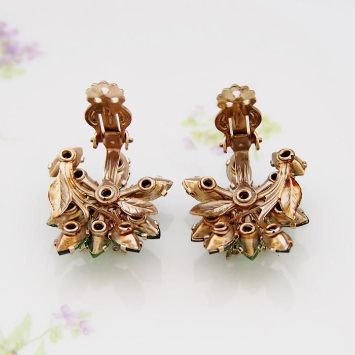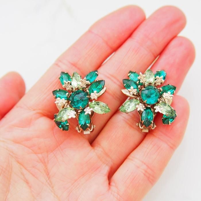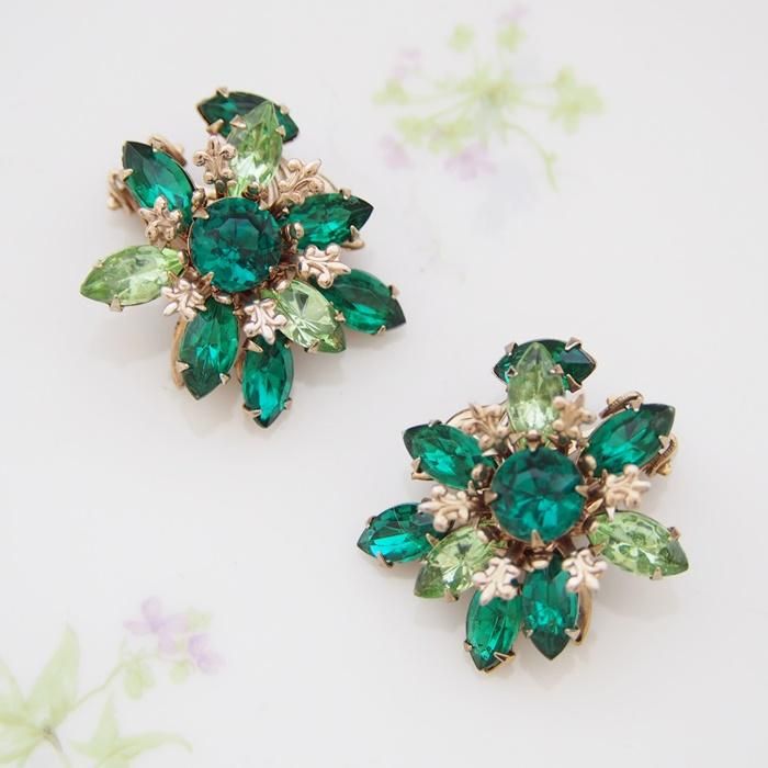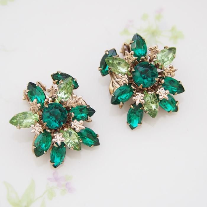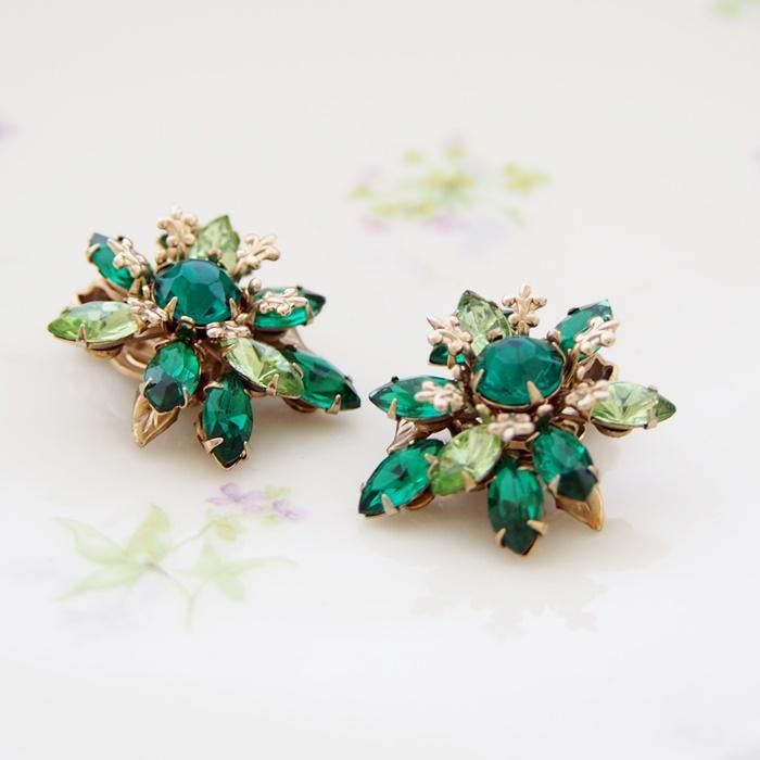 グリーンラインストーンのフラワーモチーフのイヤリングです。
