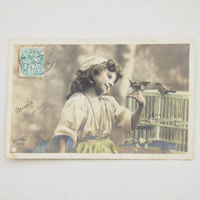アンティーク ポストカード フランス 小鳥と少女