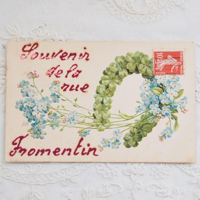 アンティーク ポストカード フランス 勿忘草 四つ葉のクローバーのホースシュー