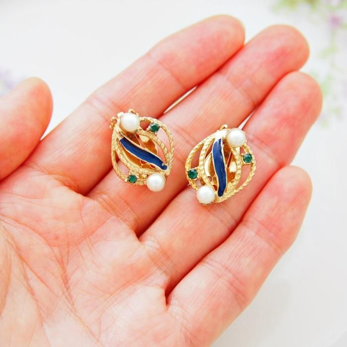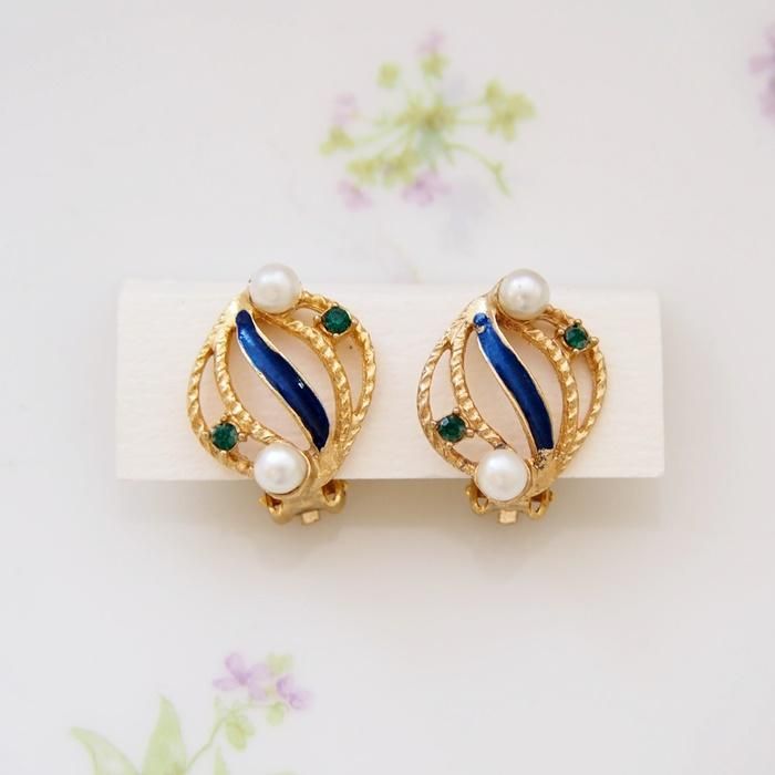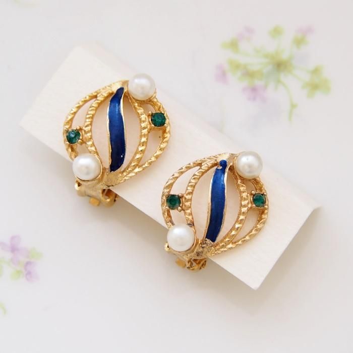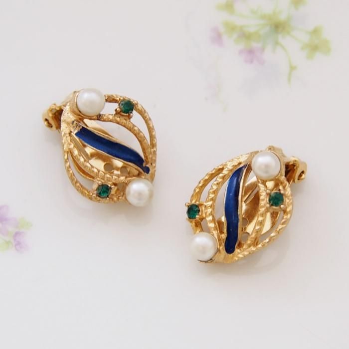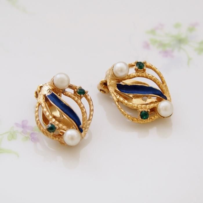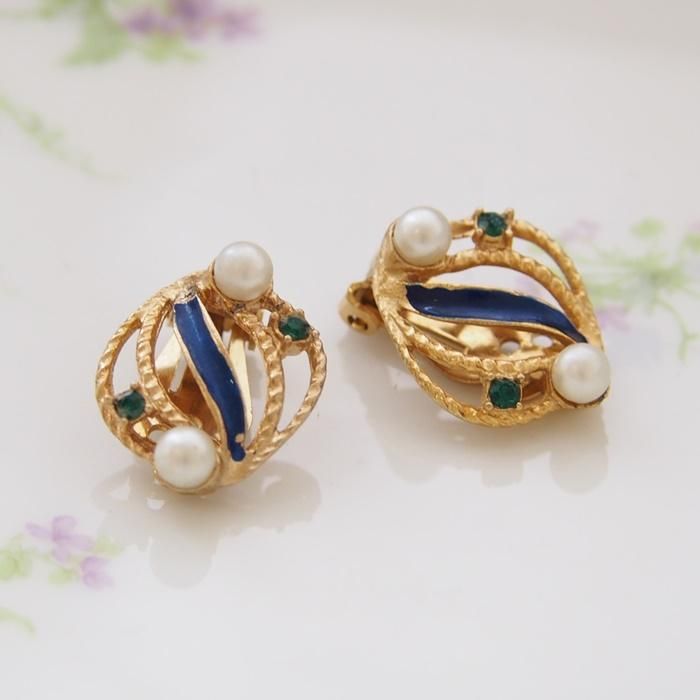 Unsigned Beauty ゴールドトーン フェイクパール ブルーエナメル グリーンラインストーン イヤリング