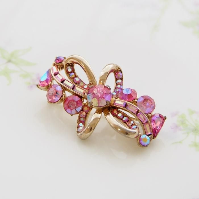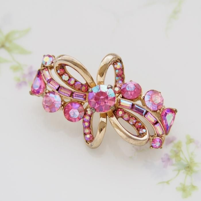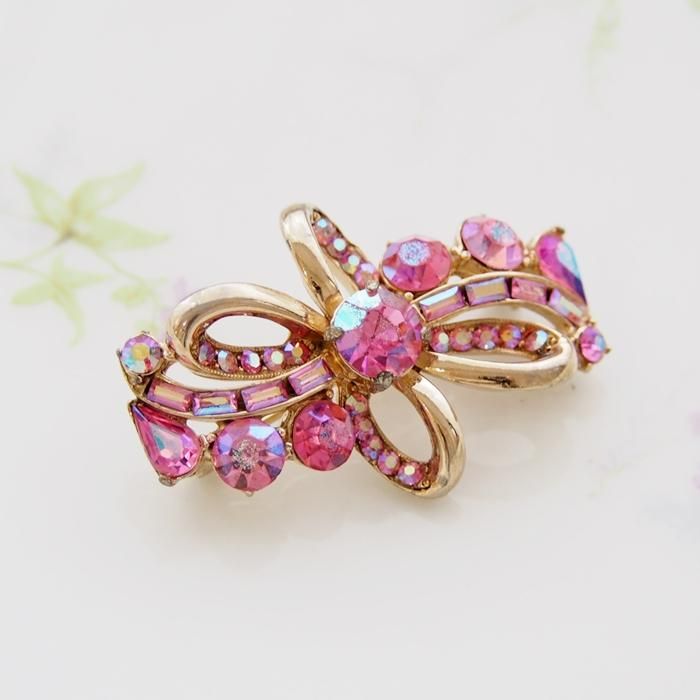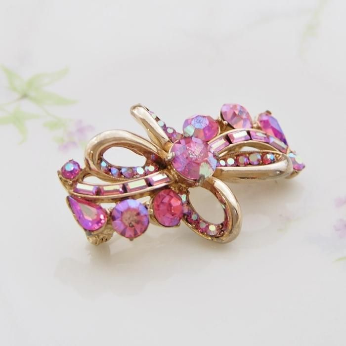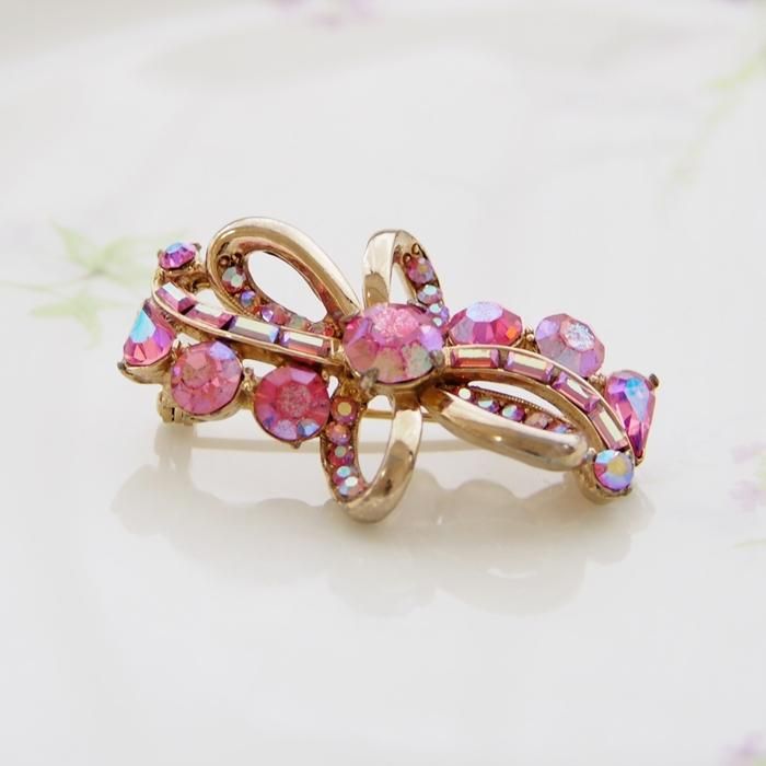 Hollycraft ホーリークラフト ピンク&オーロララインストーン リボン ブローチ