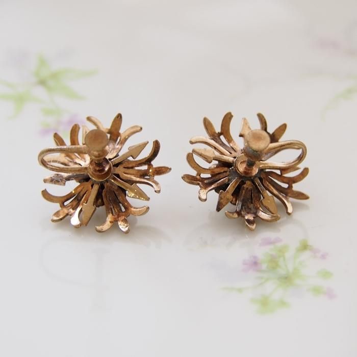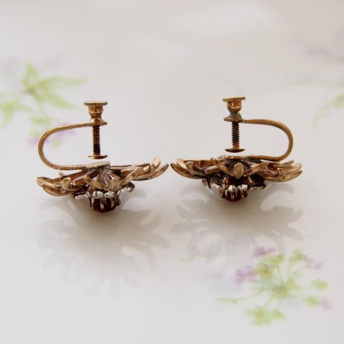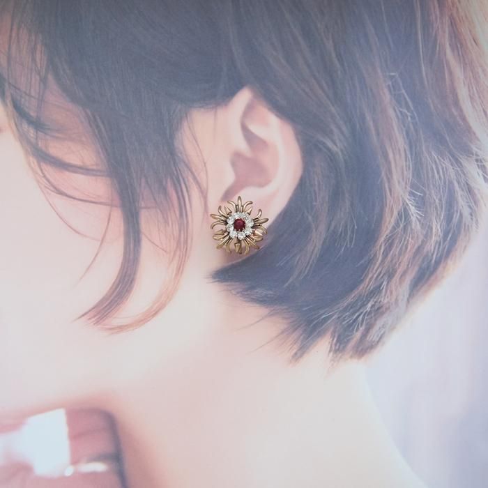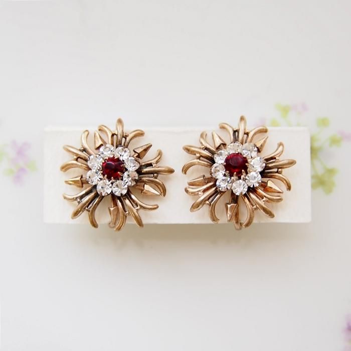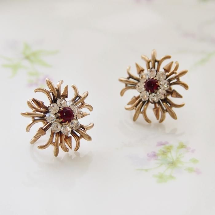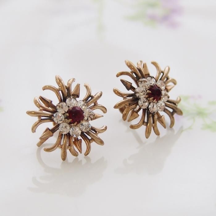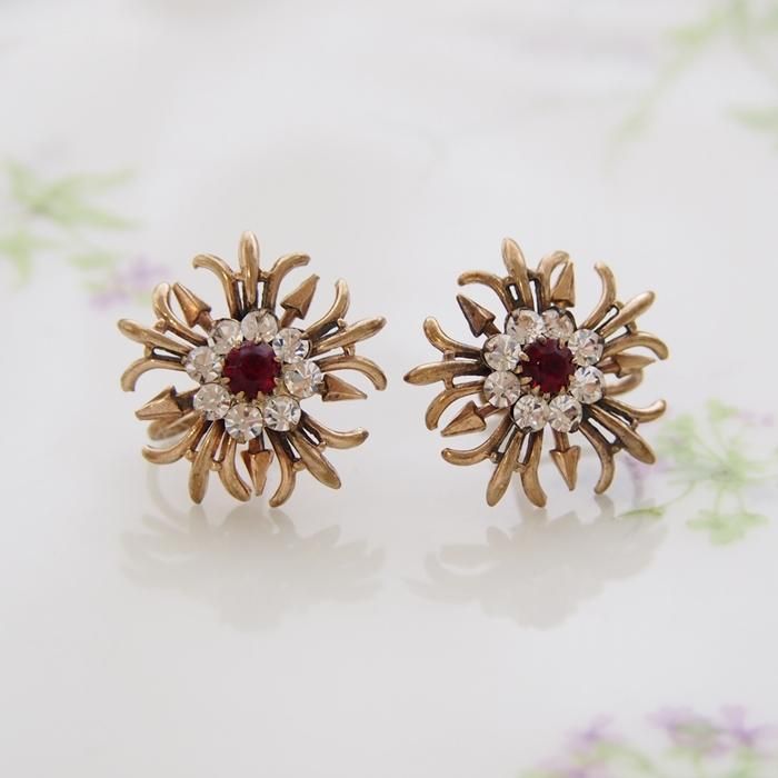 レッド&クリアラインストーンのフラワーモチーフのイヤリングです。