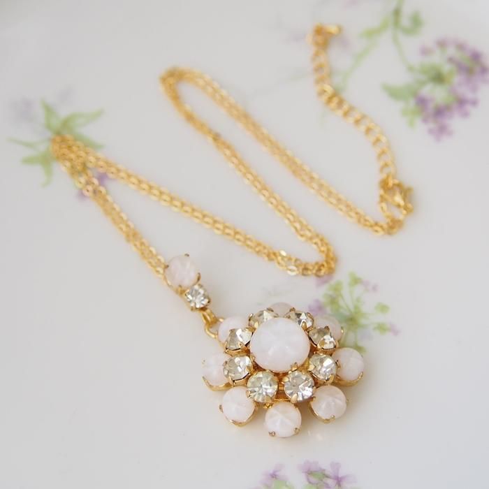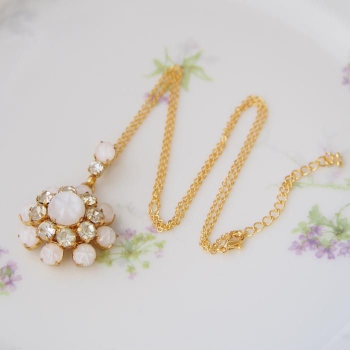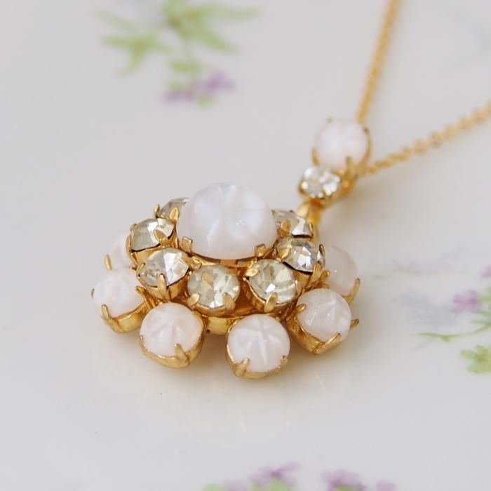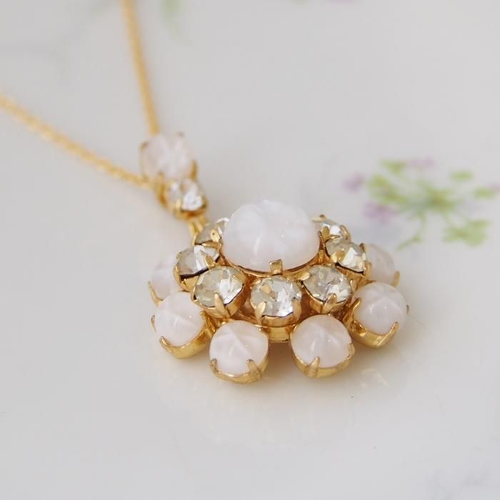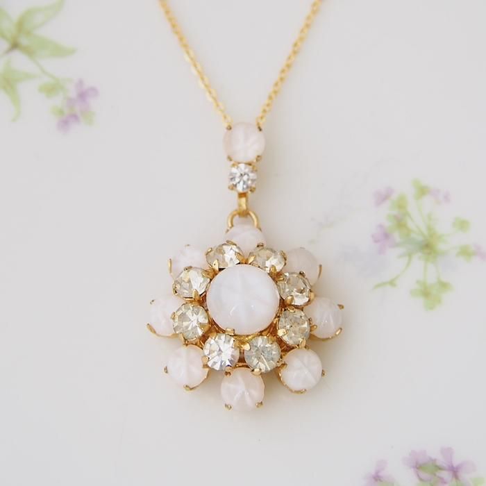 ミルキーホワイトのカボションのフラワーモチーフのネックレスです。