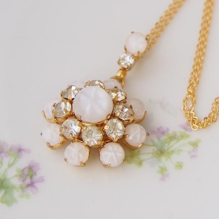 Unsigned Beauty ゴールドトーン ミルキーホワイトカボション フラワー ペンダント・ネックレス