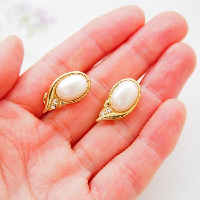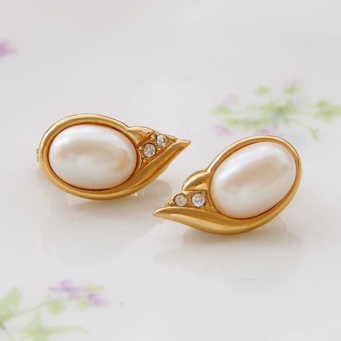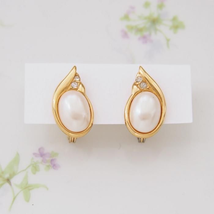 オーバルシェイプのフェイクパールカボションのイヤリングです。