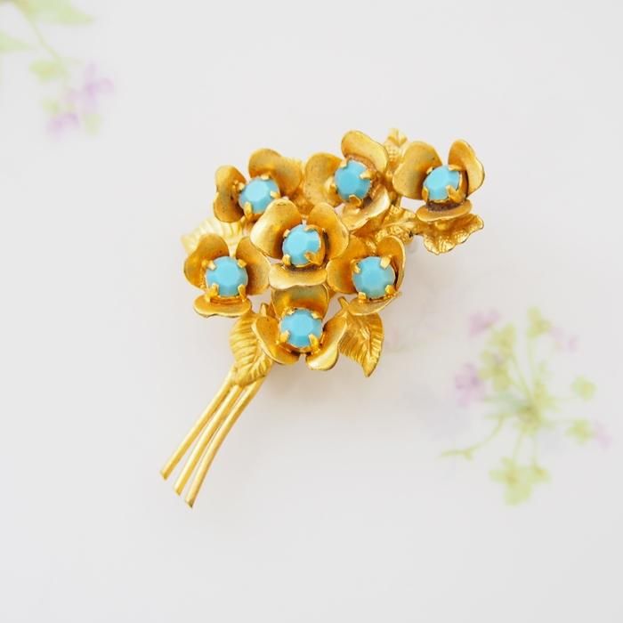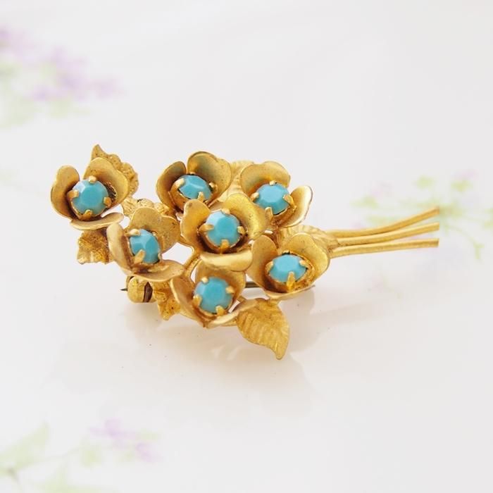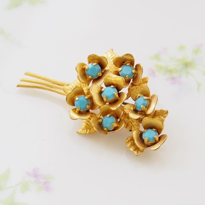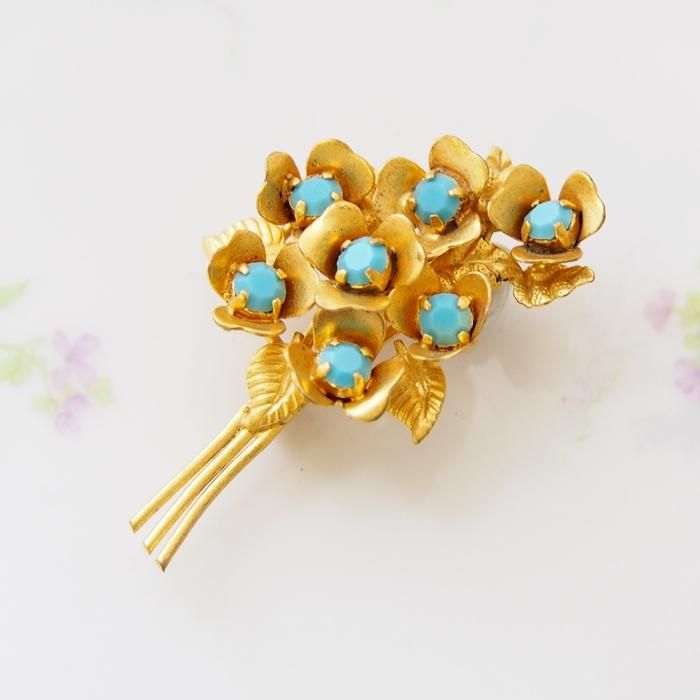 Unsigned Beauty ゴールドトーン ブルーラインストーン フラワー ブローチ