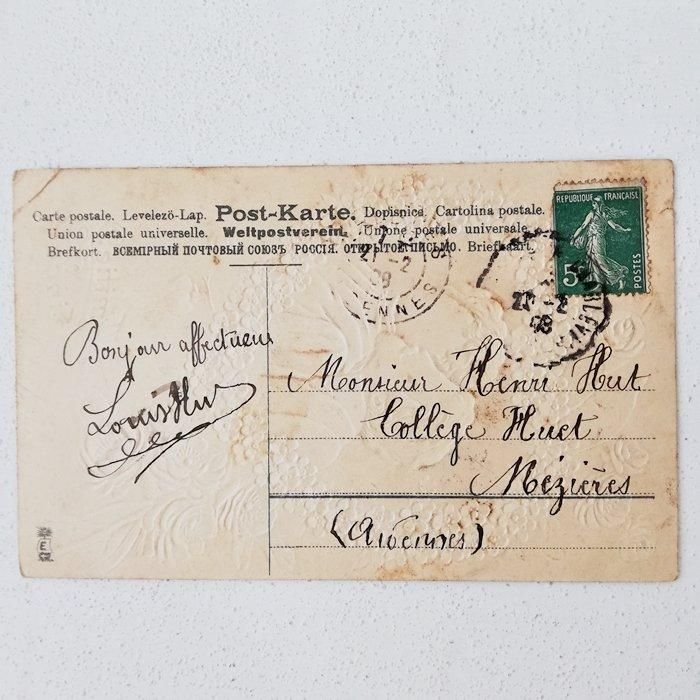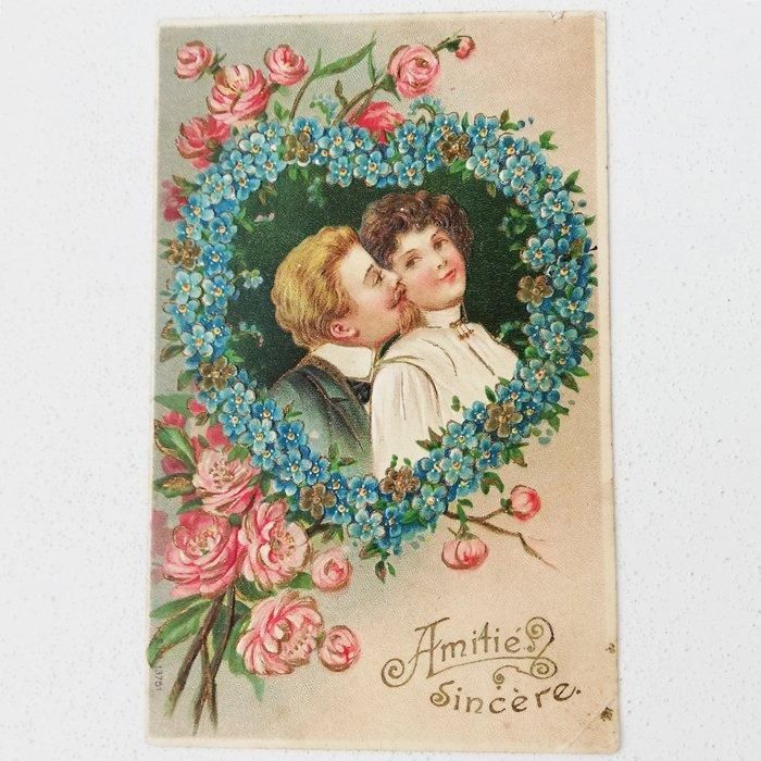 アンティーク ポストカード フランス 勿忘草のハート カップル