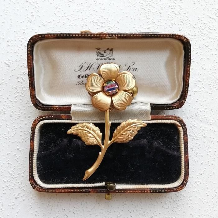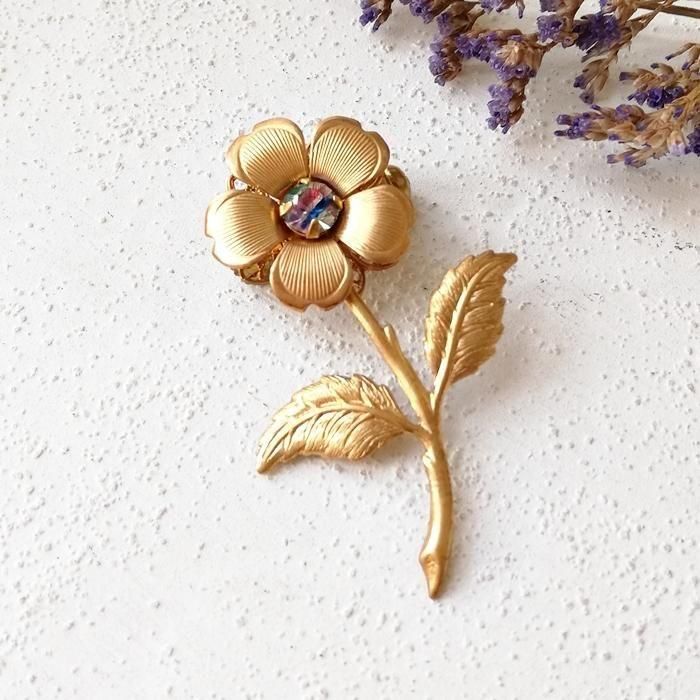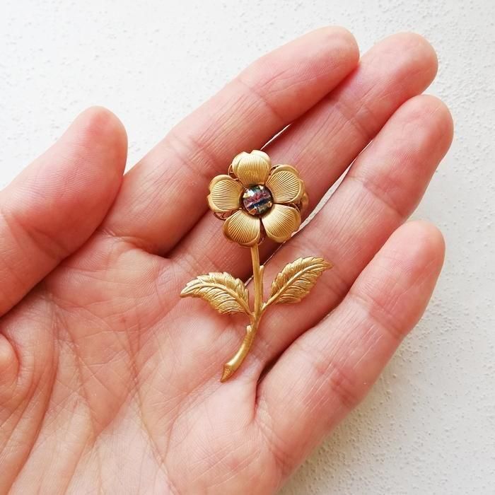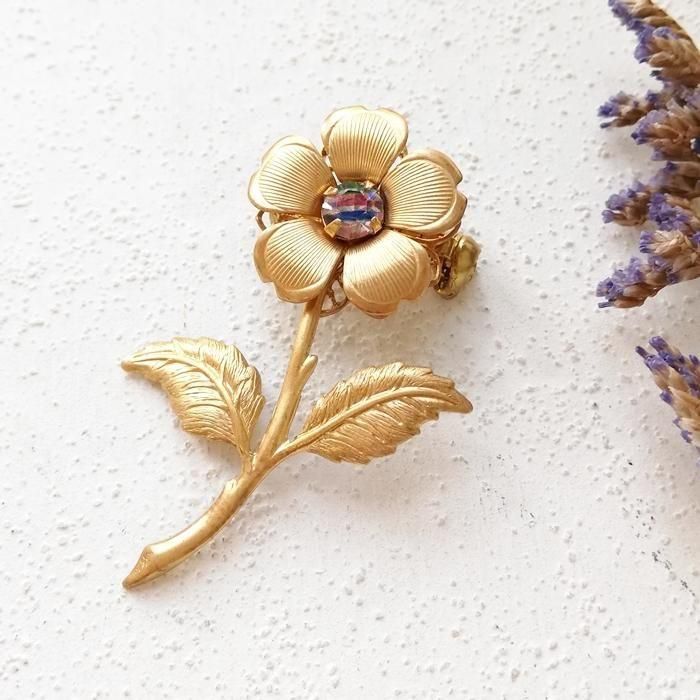 お花の中心にアイリスガラスがセットされたフラワーモチーフのブローチです。