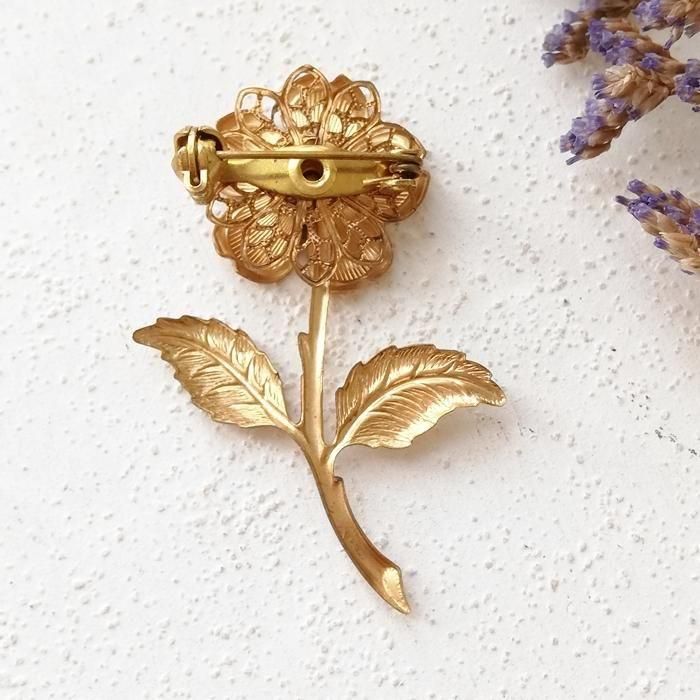 ヴィンテージスタイル アイリスガラス フラワー ブローチ / 50x33mm / ゴールドトーン