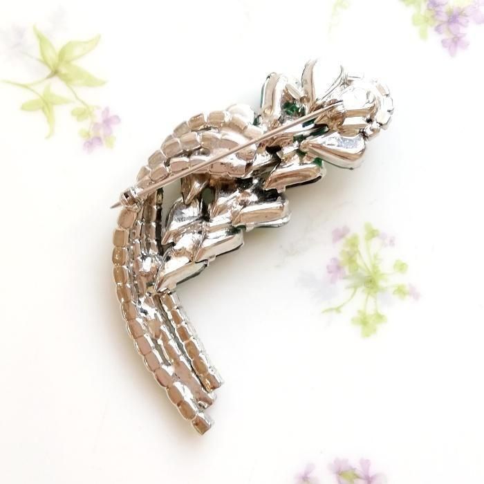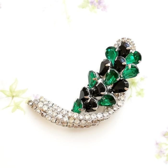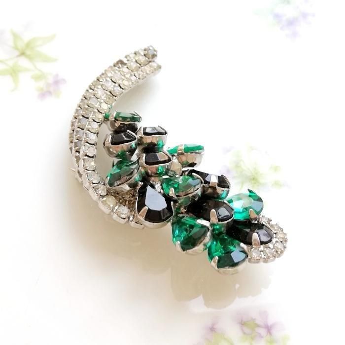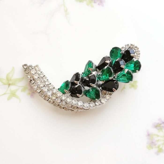 Unsigned Beauty ゴールドトーン グリーン&ブラックラインストーン ボタニカル ブローチ