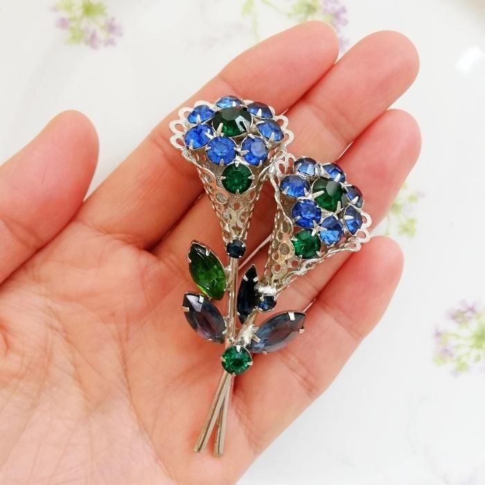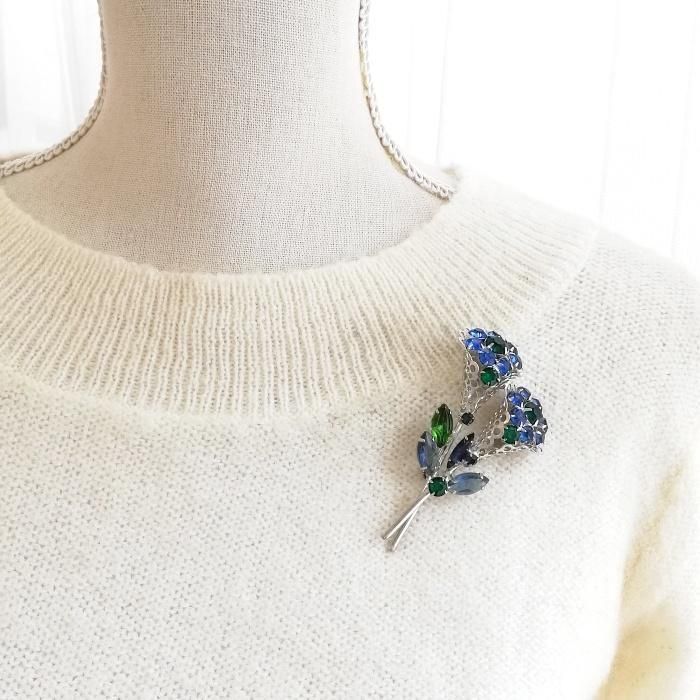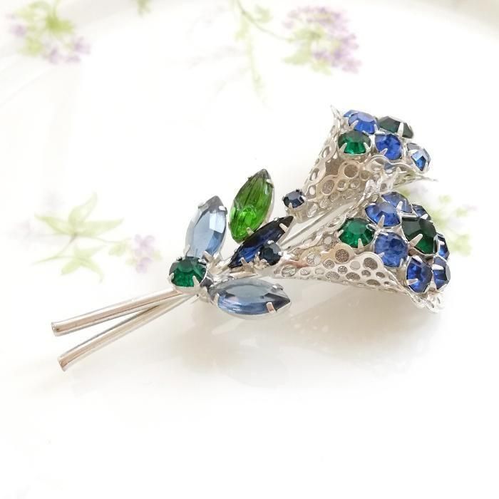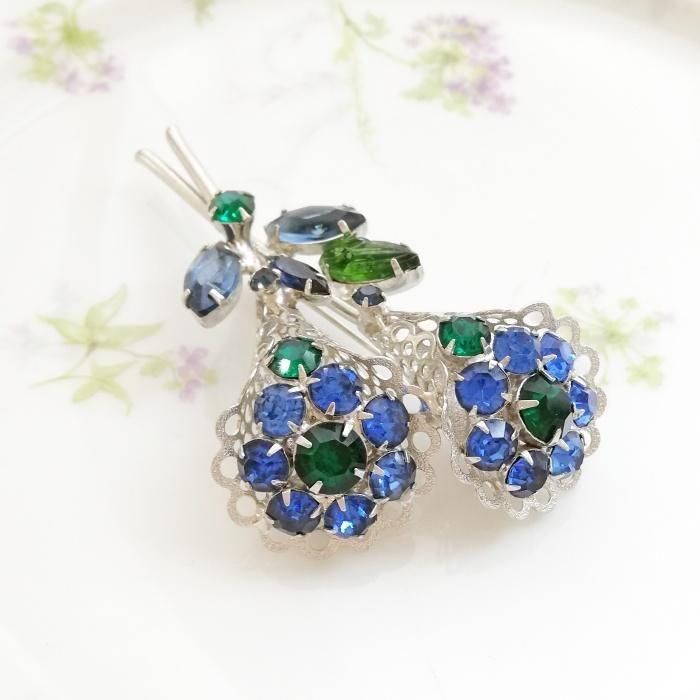 ブルー&グリーンラインストーンのフラワーモチーフのブローチです。