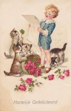 アンティーク ポストカード 歌う少年と猫たち ピンクの薔薇
